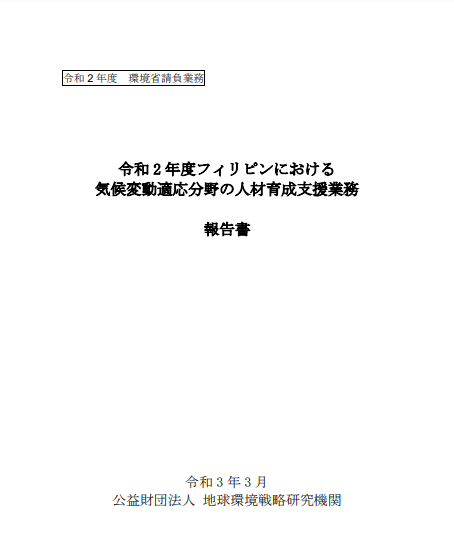環境省では平成28 年度より、アジア太平洋地域における気候変動適応分野の知見共有、人材育成に関する支援業務をフィリピンにおいて実施してきた。  本業務では令和元年(平成31 年)度の「アジア太平洋地域における気候変動適応分野の知見共有、人材育成支援業務」の2.(1)「政策支援ツールの開発・適用」の成果を用い、参加型流域土地管理方法論(以下「PWLM」という。)がフィリピン国内で更に広く活用されるような人材育成を実施した。また、PWLM が河川流域のみならず、沿岸地域の土地利用計画にも活用できるよう必要な機能拡張を実施した。 (1)政策支援ツールの運用にかかわる人材育成としては、PWLM を構成するツールのうち、平成31 年度業務までに実施していない河川氾濫モデル(HEC-HMS/RAS...