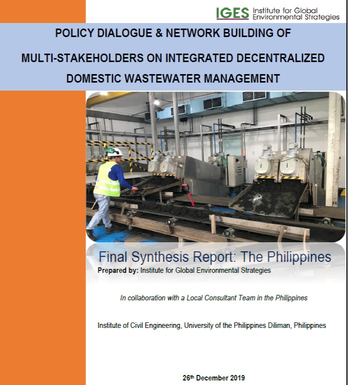 This report presents the results of fact-finding investigation and surveys on decentralised domestic wastewater management in the Philippines, as a part of the commission work under the Japan-ASEAN Integration Fund (JAIF) project on: "Policy Dialogue and Network Building of Multi-stakeholders on Integrated Decentralised Domestic Wastewater...