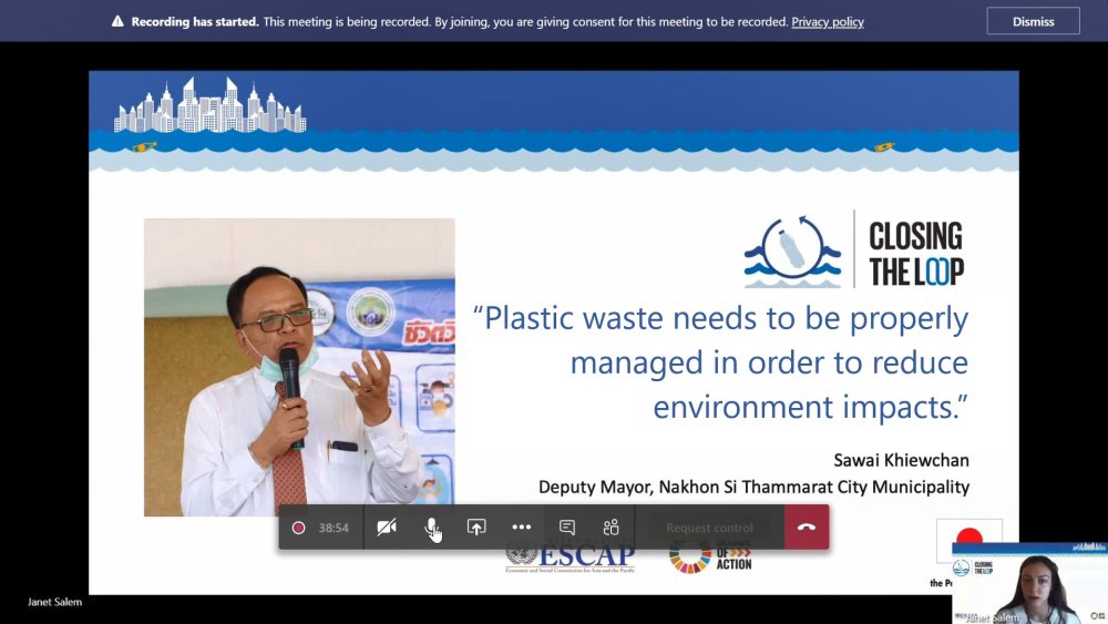 On 23 July, IGES, in partnership with the United Nations Economic and Social Commission for Asia and the Pacific (ESCAP), and with financial support from the Government of Japan, held a virtual City to City Inception Meeting with local governments from four selected Asian cities: Kuala Lumpur, Malaysia; Surabaya, Indonesia; Da Nang, Vietnam and; Nakhon Si Thammarat, Thailand. As part of the ESCAP project “Closing the Loop: Scaling up Innovation to Tackle Marine Plastic Pollution in ASEAN Cities,” the meeting introduced the city teams to each other, informed them about the project, and promoted learning about each city’s plastic waste management policy goals, challenges, and early successes.