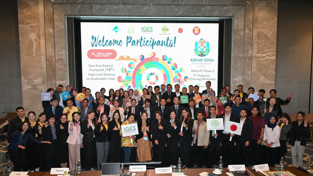 The 2nd Regional (Closing) Workshop of the ASEAN SDGs Frontrunner Cities Programme (Phase 2) took place during 26-28 November 2024 in Bangkok, Thailand, with around 99 participants (physical). These included representatives from ASEAN Member States, participating cities in the SDGs Frontrunner Cities Programme, the ASEAN Secretariat, IGES (the implementing agency); as well as various additional Thai cities and Kitakyushu City, Japan. The event was held back-to-back with the 14th East Asia Summit High-Level Seminar on Sustainable Cities (14th HLS), aiming to foster regional cooperation in addressing urban sustainability challenges.