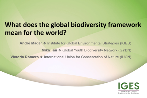 The next meeting of the Conferrence of the Parties (COP16) will be from 21 October to 1 November in Cali, Colombia. Among the many items on the agenda are progress on the preparation of targets and updating of national biodiversity strategies and action plans (NBSAPs) in line with the GBF. Learn more about this and other key talking points in a recent IGES interview with CBD experts in the webinar link and other links below.