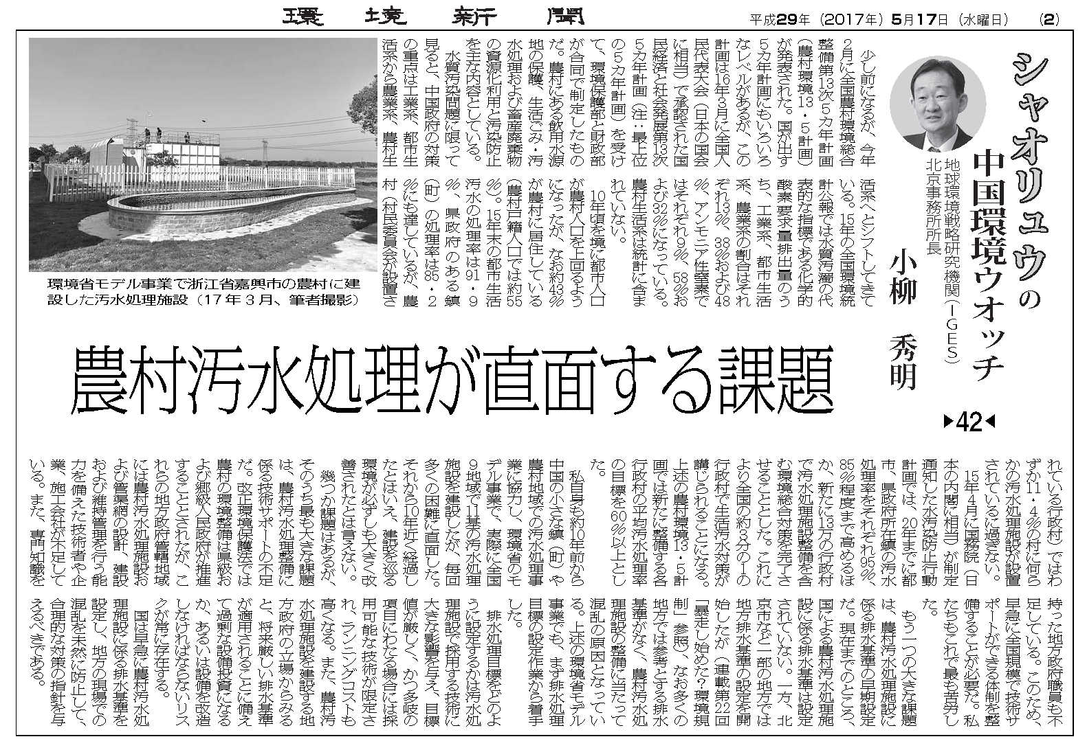 Non Peer-reviewed Article May 2017 May 2017 農村汚水処理が直面する課題-シャオリュウの中国環境ウォッチNo.42- In 環境新聞 2017/5/17 Author: Hideaki KOYANAGI http://www.kankyo-news.co.jp/ More