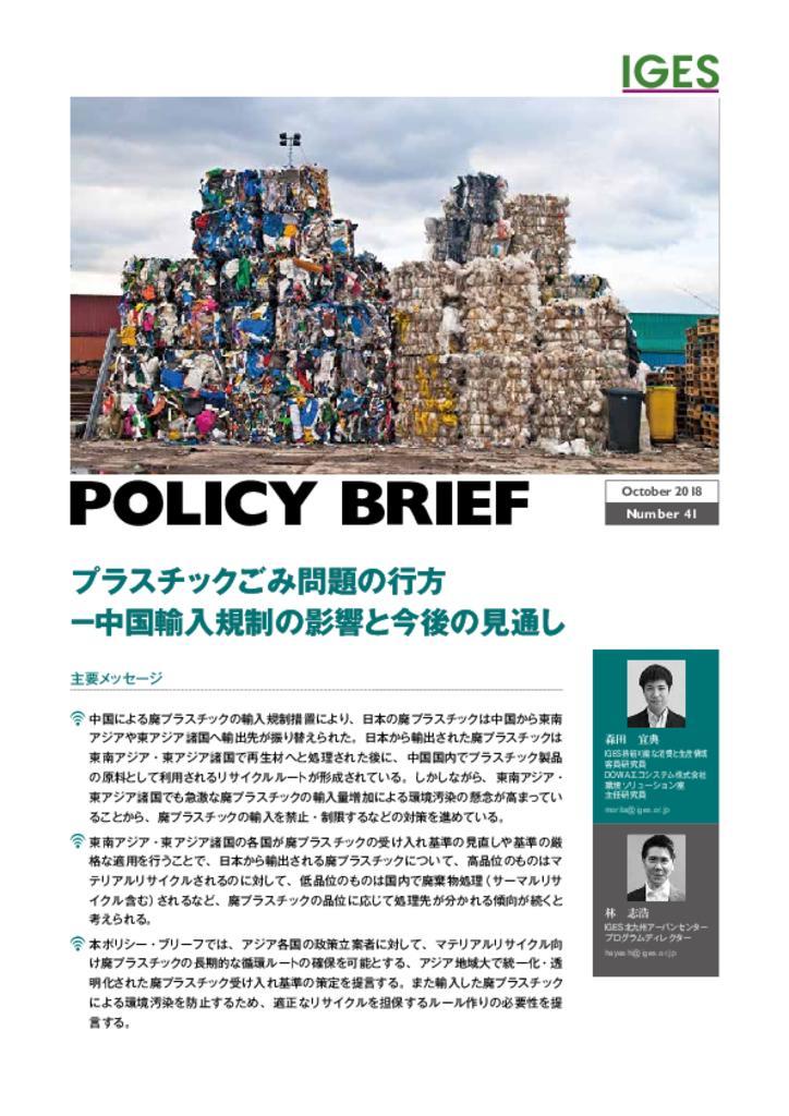 This policy brief surveys the trends and issues related to international material recycling routes for plastic scrap exported from Japan that have been rapidly changing since 2017, considers potential future developments, and proposes policy recommendations for securing a stable and environmentally sound material recycling process for plastic scrap...