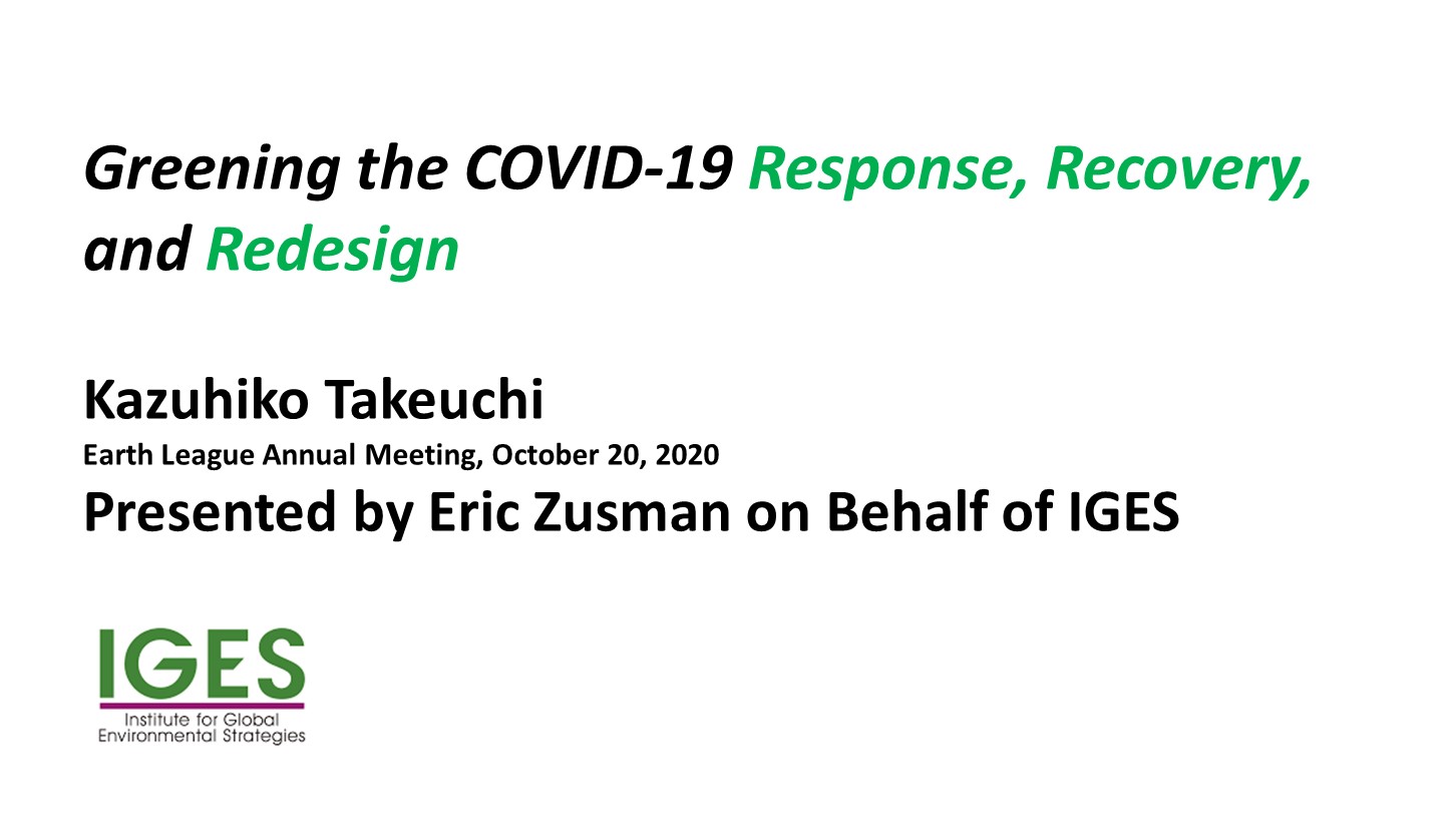 This presentation, delivered by Eric Zusman on behalf of IGES President Kazuhiko Takeuchi at the Earth League Annual Workshop on 20 October 2020, is entitled "Greening the COVID-19 Response, Recovery, and Redesign" and outlines the IGES Triple R Framework, the case for integrated approaches to respond to COVID-19, and potential applications of the...