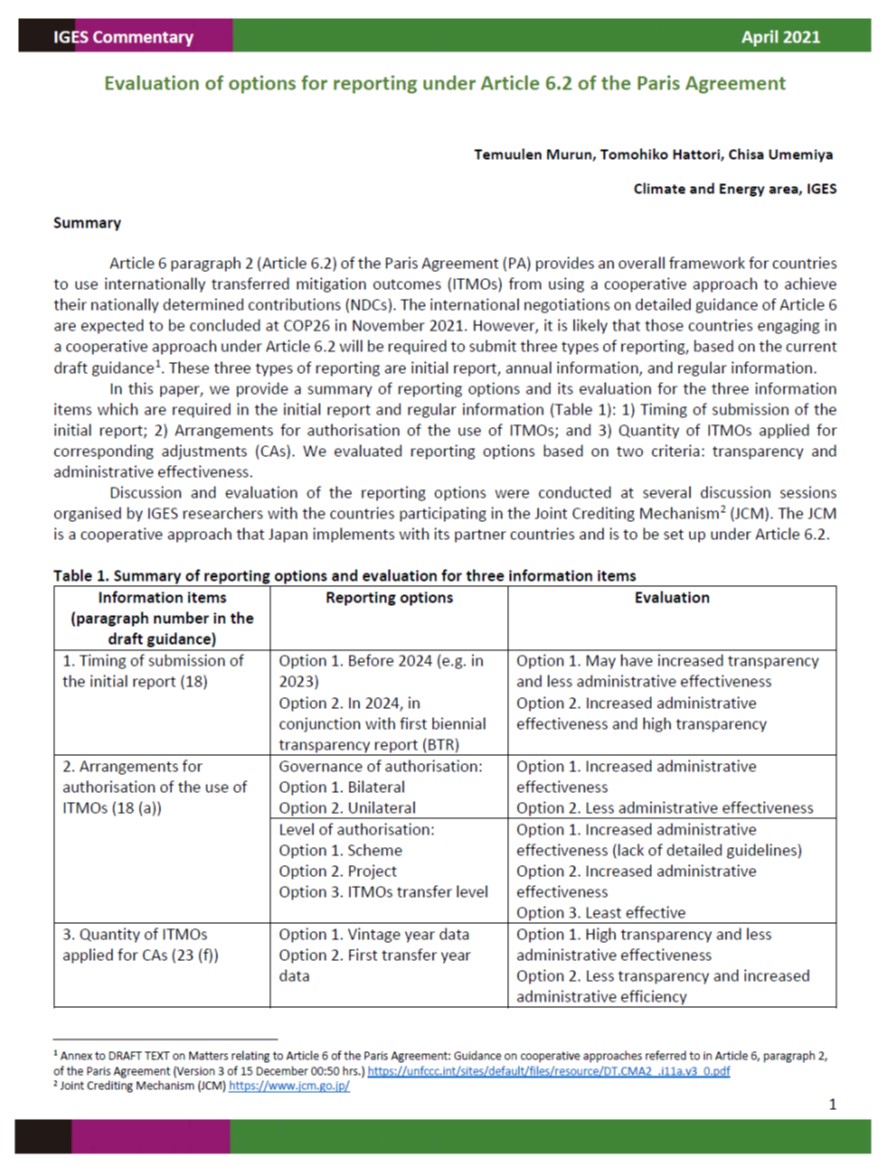 Commentary on reporting options under Article 6.2 of the Paris Agreement. In this paper, we provided a summary of reporting options and its evaluation for the three information items which are required in the initial report and regular information under Article 6.2 of the Paris Agreement: 1) Timing of submission of the initial report; 2)...