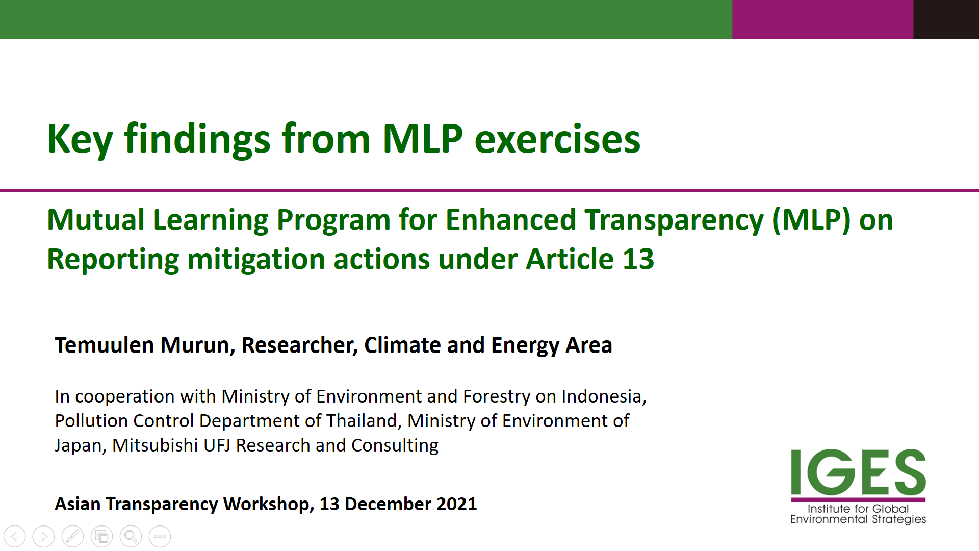 This presentation was presented at the Asian Transparency Workshop on Dec 2021. The presentation summarizes the key findings from Mutual Learning program for Enhanced Transparency on reporting mitigation actions under Article 13 of the Paris Agreement.
