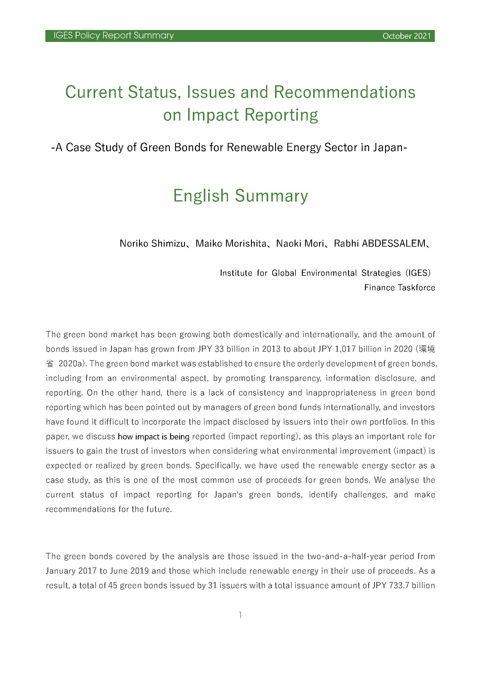 We analyse the current status of impact reporting for Japan's green bonds, identify challenges, and make recommendations for the future. The green bonds covered by the analysis are those issued in the two-and-a-half-year period from January 2017 to June 2019 and those which include renewable energy in their use of proceeds. As a result, a total of...