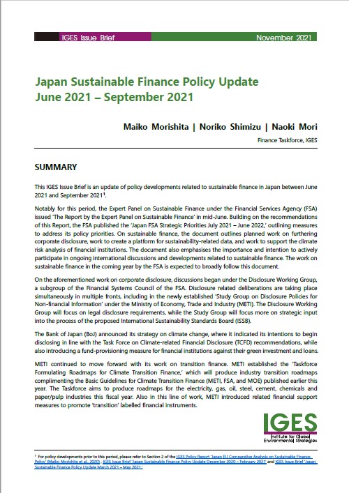 This IGES Issue Brief is an update of policy developments related to sustainable finance in Japan between June 2021 and September 2021 . SUMMARY Notably for this period, the Expert Panel on Sustainable Finance under the Financial Services Agency (FSA) issued ‘The Report by the Expert Panel on Sustainable Finance’ in mid-June. Building on the...
