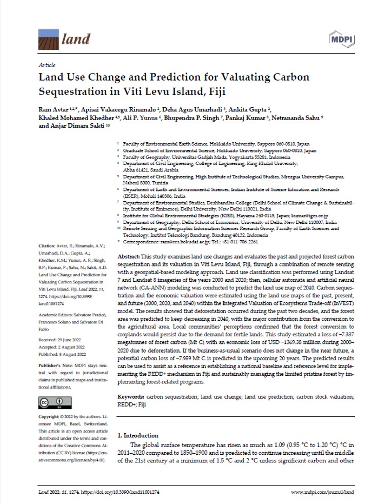 This study examines land use changes and evaluates the past and projected forest carbon sequestration and its valuation in Viti Levu Island, Fiji, through a combination of remote sensing with a geospatial-based modeling approach. Land use classification was performed using Landsat 7 and Landsat 8 imageries of the years 2000 and 2020; then, cellular...