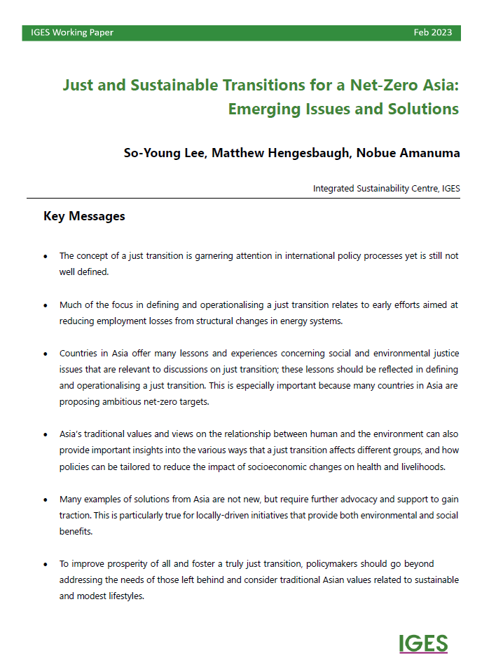 This is the Editorial of the first IGES-initiated Special Feature of the Sustainability Science journal. This Special Feature on Just and Sustainable Transitions in Net-Zero Asia aims to highlight how researchers, policymakers, and practitioners across Asia are applying just transition thinking to address pressing environmental challenges, climate...