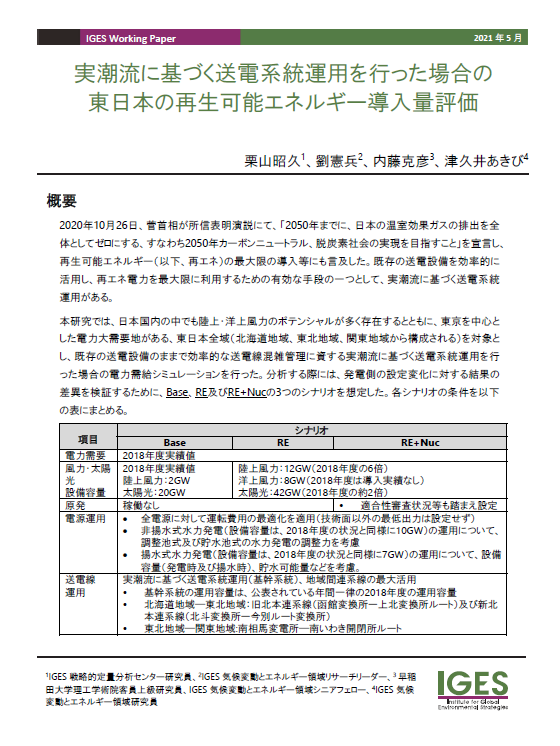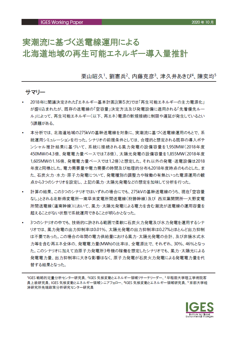 本分析では、北海道地域の275kVの基幹送電線を対象に、実潮流に基づく送電線運用のもとで、系統運用シミュレーションを行った。シナリオの前提条件としては、合理的と想定される既存の導入ポテンシャル推計結果に基づいて、系統に接続される風力発電の設備容量を1,950MW(2018年度450MWの4.3倍、発電電力量ベースでは7.8倍)、太陽光発電の設備容量を1,855MW(2018年度1,605MWの1.16倍、発電電力量ベースでは1.2倍)と想定した。それ以外の発電・送電設備は2018年度と同様とした。電力需要量や電力需要の時間及び地理的分布も2018年度時点のものとした。また、石炭火力・水力・原子力発電について、発電種別の調整力や稼働の有無といった電源運用の観点から3つのシナリオを設定し...