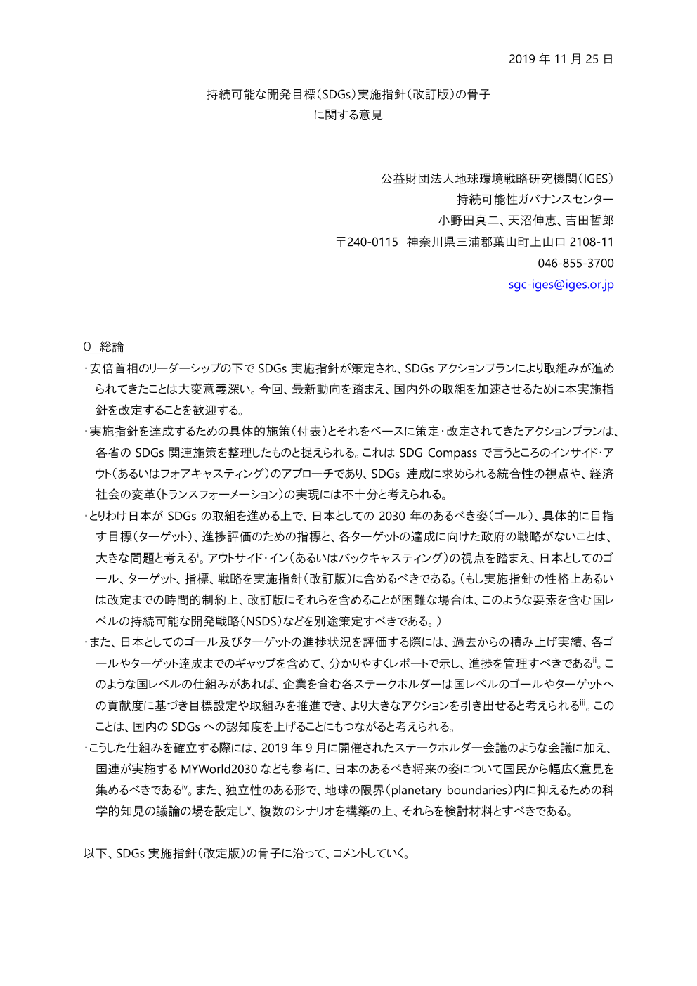 IGES 研究員が、 SDGs 推進本部幹事会が作成し、内閣府と外務省が意見募集した「持続可能な開発目標( SDGs )実施指針(改定版)の骨子」に対して提出したパブリックコメントです。 実施指針(改定版)の骨子は以下よりご覧いただけます。 https://www.kantei.go.jp/jp/singi/sdgs/pdf/jisshi_shishin_r011108.pdf